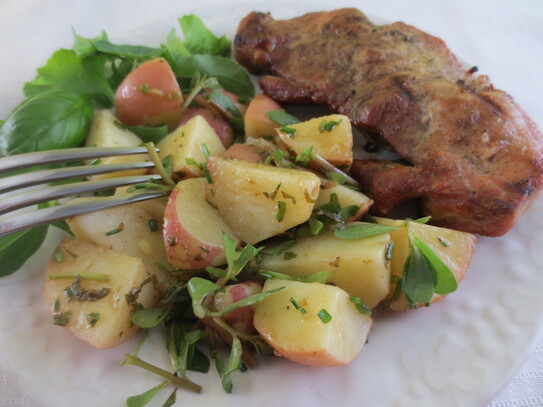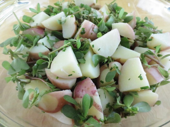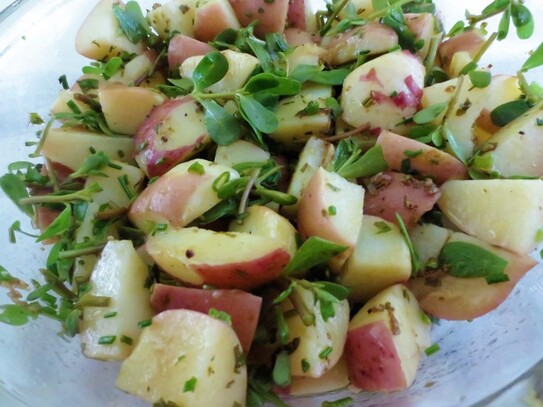 Vă sugerăm să încercaţi această minunată salată de cartofi noi cu iarbă grasă la care se adaugă o vinegretă simplă, gustoasă şi deosebit de aromată.