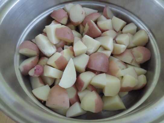 Pentru prepararea salatei, se fierb mai întâi cartofii. Aceştia se curăţă de noduri şi de pieliţa care este deja desprinsă. Se pot fierbe întregi cu puţină sare iar după ce au fiert se scurg de apă. Cartofii se trec apoi prin jet de apă rece şi pentru a se răci mai repede cât şi pentru a evita zdrobirea acestora. Când sunt răciţi se curăţă de pieliţa ce s-a desprins la fiert apoi cartofii se taie în bucăţi de mărimea dorită.