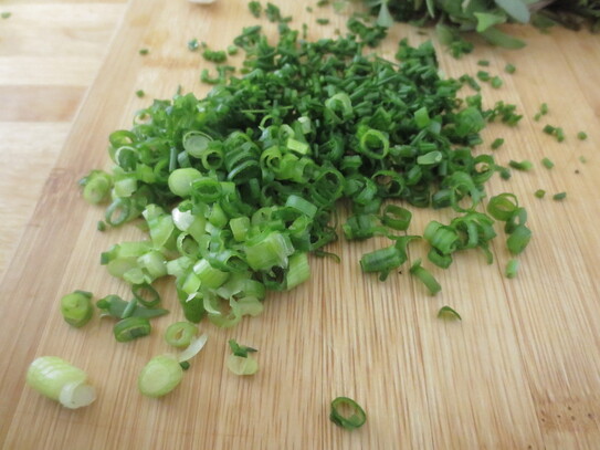 Într-un castron de mărime potrivită se pun cartofii fierţi, iarba grasă şi ceapa verde tăiată în rondele.