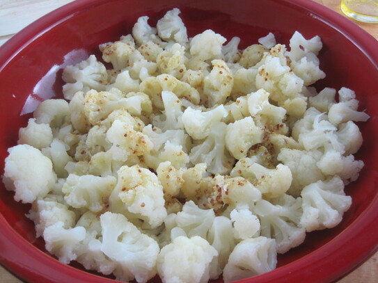 După ce se spală bine sub jet de apă rece şi se desface în bucheţele, conopida se fierbe timp de un minut în apă sărată. Se strecoară şi se lasă să se răcească complet.