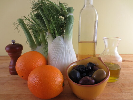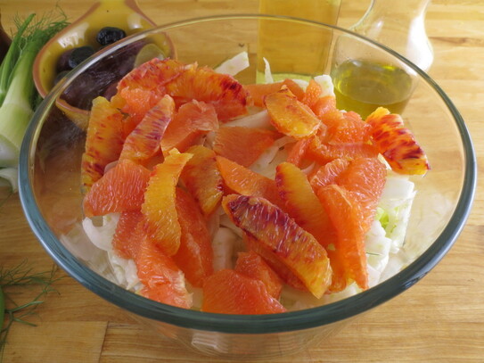 Feniculul tăiat subţire, se amestecă într-o salatieră împreună cu feliile de portocale, măsline şi amestecul de ulei şi oţet. Pe deasupra se presară piper proaspăt măcinat şi o linguriţă de frunze verzi de fenicul, culese de pe tulpina aţoasă care a fost îndepărtată.
