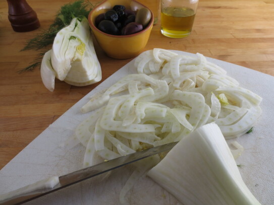 Bulbul de fenicul se spală bine cu apă călduţă, apoi se taie în jumătate pe lungime. Se îndepărtează partea cotoroasă de la rădăcină, precum şi tulpinile aţoase. Partea fragedă se taie în felii cât mai subţiri.