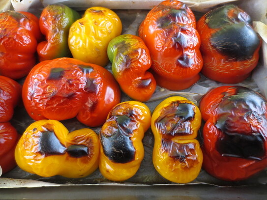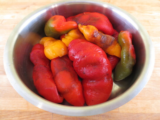 Jumătăţile curăţate se pun într-o tavă şi se coc la cuptor la grill. Tava nu se pune imediat sub flacăra, pentru că ar arde gogoşarii. Grătarul pe care se aşează tava se pune cu o poziţie mai jos. Focul se dă la temperatură mare. Gogoşarii se întorc pe partea cealaltă, iar după ce au prins o crustă uşor maronie de scot din cuptor şi se pun la răcit într-o oală acoperită cu capac. Se lasă deoparte între 15 minute sau o jumătate de oră. Se procedează la fel cu gogoşarii rămaşi până când toţi au fost copţi.