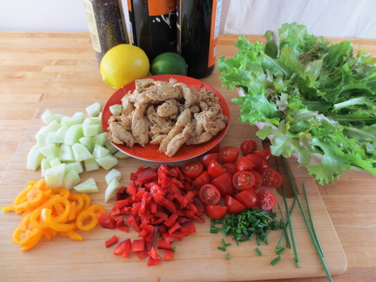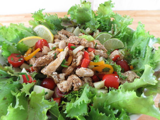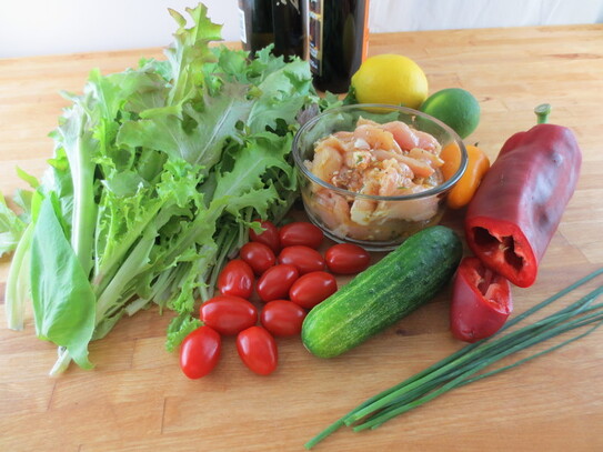 Salata de pui cu legume proaspete este o opţiune versatilă pentru o cină sănătoasă şi uşoară. Ardeii şi roşiile dau culoare şi savoare salatei proaspete, iar carnea de pui complementează prin adaosul de proteine. Datorită marinării în suc de lămâie şi ulei de măsline, carnea rămâne fragedă şi moale, cu condiţia să nu fie ţinută pe foc mai mult decât e necesar. Această salată este de asemenea un fel de mâncare potrivit pentru un picnic la iarbă verde sau poate fi folosită ca şi umplutură pentru sandviciuri.