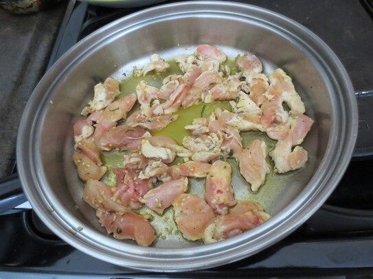 Carnea de pui se aşează într-un singur strat într-o tigaie mare, apoi se acoperă cu sucul în care s-a marinat . Se aduce la fierbere la foc mediu-mare. Puiul se întoarce pe cealaltă parte, apoi se reduce focul la mediu şi se continuă gătirea până când bucăţile de carne se rumenesc bine pe ambele părţi şi carnea e pătrunsă (aproximativ 6 min). Se dă la o parte şi se lasă să se răcească.
