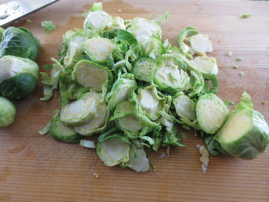 Varza de Bruxelles se taie în rondele pe lăţime. Opţional, varza se poate fierbe pe aburi 10-15 minute, după care se scurge de apa fierbinte, şi se răceşte sub jet de apă rece. În acest fel îşi păstrează culoarea vibrantă.