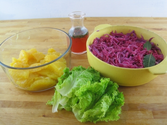 Într-un castron separat, se amestecă restul de vinegreta cu frunzele de salată tăiate în bucăţi, apoi se iau şi se pun de jur împrejurul verzei, alternând cu felii de portocală. Se serveşte imediat.