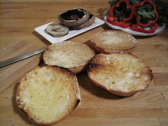 Peste ciupercă se pune cealaltă rondea de ardei, restul de salată şi cealaltă bucată de chifla rămasă.