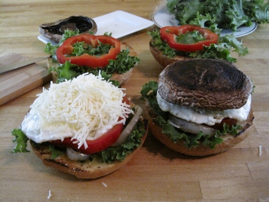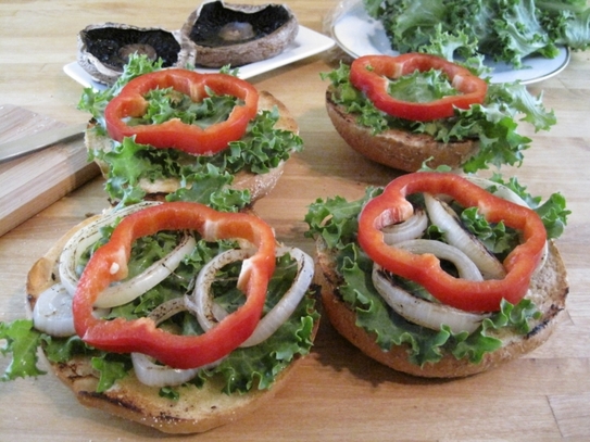 Peste una din jumătăţile de chifla prăjită şi unsă, puneţi cu generozitate frunze de salată proaspătă, după care aşezaţi rondele de ceapă şi câteva rondele de ardei. Peste legume, se pune oul cât e încă fierbinte, se presară generos cu brânză, după care se pune ciuperca coaptă.
