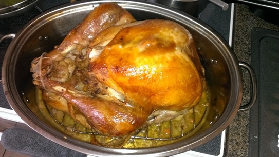 Scoateţi pielea şi oasele de la un pui mic şi tocaţi carnea, adăugând şi puţină carne de mânzat sau carne de porc şi o felie de pâine albă înmuiată în lapte şi stoarsă. Adăugaţi apoi două gălbenuşuri, sare, verdeaţă tocată, o lingură de mazăre, ardei, şi albuşurile de ou bătute. Umpleţi curcanul cu amestecul obţinut şi coaseţi-l bine. Fierbe-ţi curcanul până când dă câteva clocote, după care puneţi-l într-o tavă. Adăugaţi puţină grăsime, vin şi câteva boabe de piper. Continuaţi să frigeţi curcanul la cuptor. Pentru a obţine o carne fragedă, din când în când turnaţi peste el zeama din tigaie.