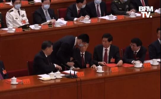 În vârstă de 79 de ani, lui Hu Jintao - care a fost preşedinte al Chinei un deceniu, se pare că i s-a cerut să părăsească locul pe care se afla, respectiv în stânga lui Xi Jinping, dar fostul lider a părut să refuze.