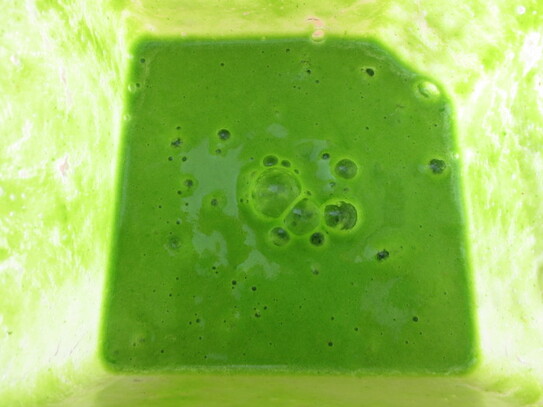 Ingredientele de mai sus se combină în blender la viteză mare până când acestea se transformă într-o pastă fină, uniformă. Dacă blenderul nu are viteză prea mare, e preferabil să mărunţiţi verdeţurile, altfel pot rămâne bucăţele mici de frunze prin băutură.