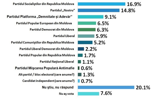 Potrivit studiului, printre primele partide care ar ajunge în Parlament se numără Partidul Socialiştilor cu 16,9 la sută, fiind urmat de Partidul Nostru cu 14,8 la sută. Pe locul trei se situează Partidul „Platforma Demnitate şi Adevăr” cu 9,1 la sută, după care şi Partidul Popular European cu 6,5 la sută.