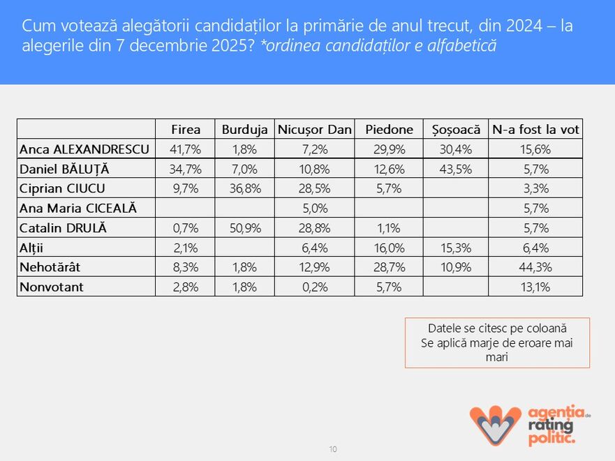 "Ştiu că fuga după 'intenţia de vot' e mare, însă veţi găsi multe explicaţii şi sugestii despre ce se întâmplă. O poză a momentului. Datele sunt culese cu 12-14 zile înainte de vot. Pentru că am folosit o metodologie mai NOUĂ, un model statistic modern, mai complex, bazat pe interviuri în panel online şi pentru că situaţia la vot este una foarte strânsă, din respect pentru competiţia electorală, nu vom publica intenţia de vot. Raportul complet este în link pe siteul Agenţiei", a afirmat Cristian Andrei.