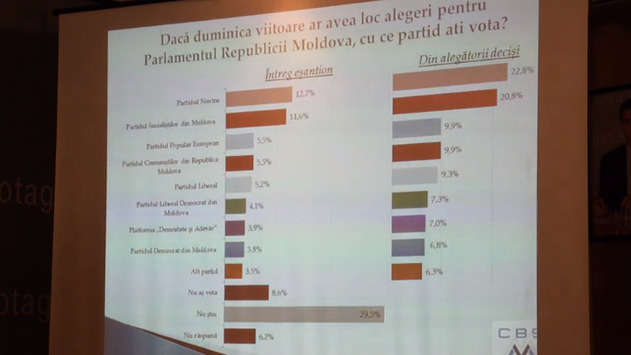 În cazul unor alegeri anticipate, potrivit sondajului, pragul electoral de 6 la sută, necesar pentru a accede în Parlament, l-ar trece următoarele formaţiuni politice: „Partidul Nostru” 22,8%; PSRM 20,8%; PPEM 9,9%; PCRM 9,9%; PL 9,3%; PLDM 7,3%; Platforma „DA” 7%; PDM 6,8%.