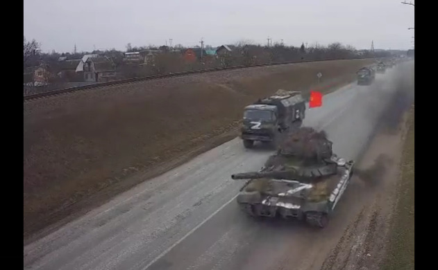 Imaginile au fost surprinse în videoclipuri filmate în Ucraina şi postate pe reţelele sociale. În imaginile video se văd tancuri cu infama literă Z, devenită simbolul invaziei, şi cu steagul roşu fluturând.