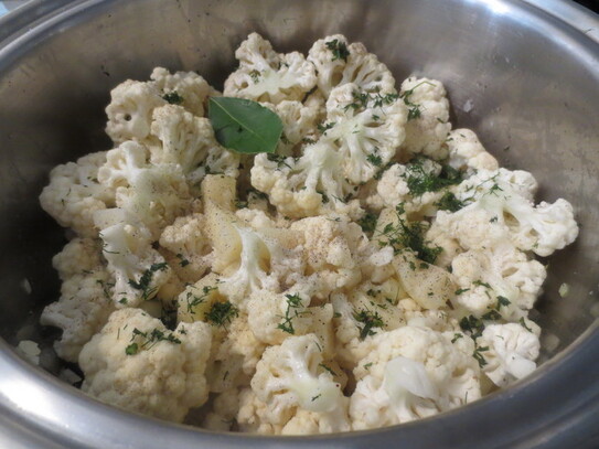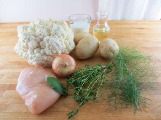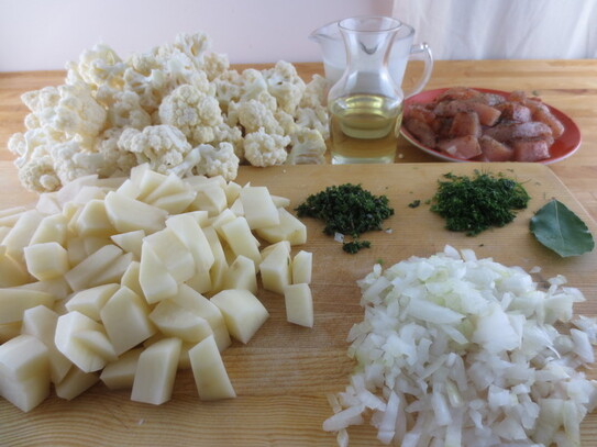 Conopida se spală şi se desface în bucheţele mici. Cartofii se curăţă de coajă şi se taie în bucăţele.
