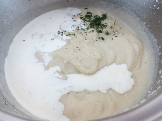Se ia de pe foc. Se ia deoparte câteva florete de conopidă fiartă, iar restul se dă prin blender până când devine pure Se adaugă smântâna subţire şi se potriveşte de sare şi piper.