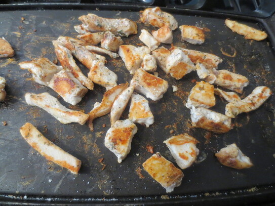 Bucăţile de carne de pui se prăjesc pe grătar sau într-o tigaie de teflon. Se adaugă în fiecare farfurie, alături de o floretă de conopidă fiartă. Se poate orna cu frunze verzi de ceapă, pătrunjel, mărar, etc, depinde de preferinţa fiecăruia.