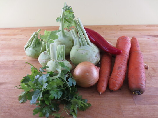 Se spală şi se curăţă zarzavatul. Guliile se taie în cubuleţe. Morcovii şi pătrunjelul se dau prin răzătoarea cu găuri mari, iar ceapa şi ardeiul se taie mărunt.