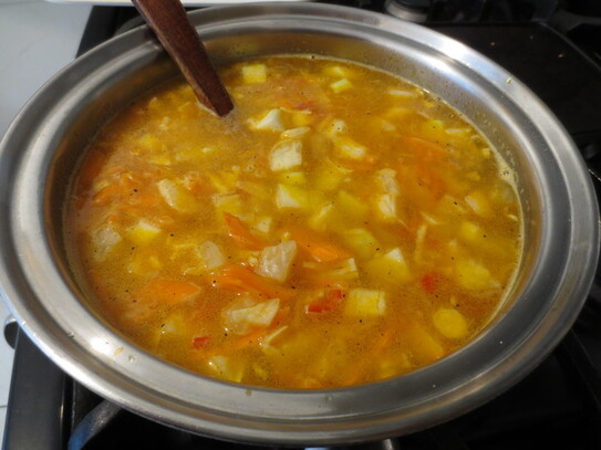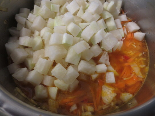 Când zarzavatul este pe jumătate fiert se adaugă guliile curăţate şi tăiate în cubuleţe. Se potriveşte de sare şi piper, se adaugă doua căni de apă fierbinte şi se lasă să fiarbă în continuare până când guliile sunt fierte.