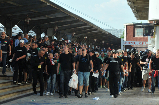 La fel s-a întâmplat şi în gara din Arad. Forţele de ordine au decis să nu intervină şi nici nu i-au sancţionat pe aceştia. Aproximativ 10.000 de poliţişti şi jandarmi îi aşteaptă pe maghiari în Capitală, numărul mare fiind motivat de dorinţa oamenilor legii de a preîntâmpina eventuale conflicte de stradă generate de meciul de sâmbătă seară.