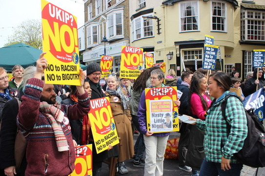 Militanţii anti-UKIP au mers tocmai în Ramsgate, municipiu din districtul Thanet, unde Nigel Farage, preşedintele partidului, candidează pentru un loc în parlamentul britanic. 95% din locuitorii acestui oraş sunt etnici britanici de culoare albă, iar regiunea are o rata considerabil mai ridicată a şomajului (4.1%) faţă de rata naţională de 2.5%. Acestea sunt doar o parte din motivele în virtutea cărora Farage, care a declarat că în cazul în care nu va obţine un loc în parlament va demisiona din fruntea partidului, a ales să candideze în această zonă.