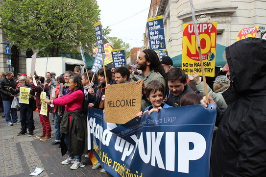 Militanţii ani-UKIP au împărţit pliante în centrul oraşului Ramsgate, iar preşedintele Europeans Party, Tommy Tomescu, român, de profesie stomatolog, a vorbit mulţimii despre români, despre acţiunile defăimătoare ale UKIP şi despre necesitatea înţelegerii între naţii.