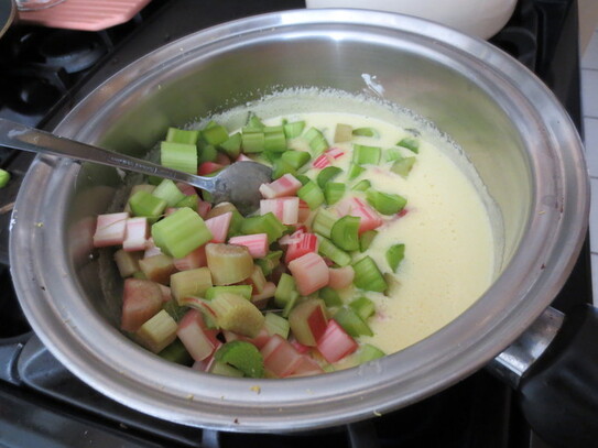 Înainte de preparare, peţiolurile de rubarbă se curăţă de pieliţa subţire colorată cu ajutorul unui cuţit, apoi se taie în bucăţi mici de un cm.