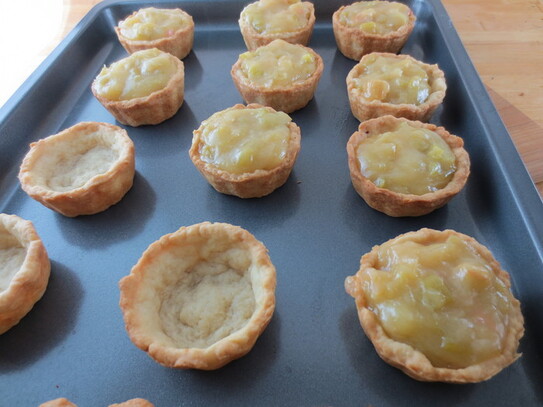 Într-o cratiţă, se combină zahărul cu cele 3 linguri amidon, gălbenuşurile şi laptele. Se amestecă împreună, apoi se adaugă rubarbărul tocat, sucul şi coaja de lămâie. Se fierbe la foc mic, amestecând continuu, până se îngroaşă. Se toarnă în crustele de tarte cât este încă fierbinte.
