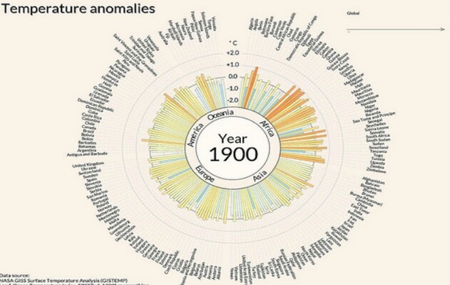 Clipul video arată cronologia datelor privind schimbările de temperatură din 190 de ţări împărţite în cinci regiuni: America, Africa, Europa, Asia şi Oceania.