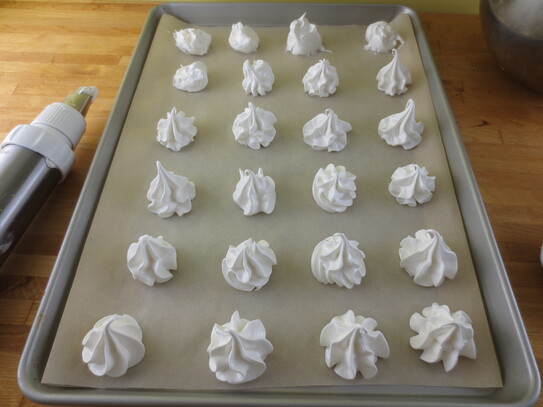 Se adaugă 2 linguri de zeamă de lămâie şi opţional 4 linguri de nucă măcinată. Se ia pe rând câte o linguriţă din spumă şi se pune în tava tapetată, lăsând 2-3 cm distanţă între bezele. Se poate folosi şi un şpriţ pentru creme. După se bezele sunt şpriţate se lasă în tavă la temperatura camerei, cam 15-20 minute pentru a se usca atât cât să prindă o crustă subţire pe deasupra.