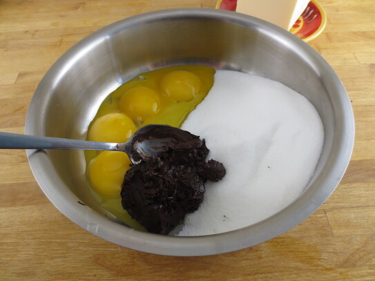 Crema se prepară pe aburi. Cele 6 gălbenuşuri se amestecă cu 200 g de zahăr, 5 linguri de cafea concentrată şi 3 linguri de cacao. Crema se amestecă încontinuu şi se dă deoparte în momentul în care aceasta începe să se lege, şi apar primele bule.