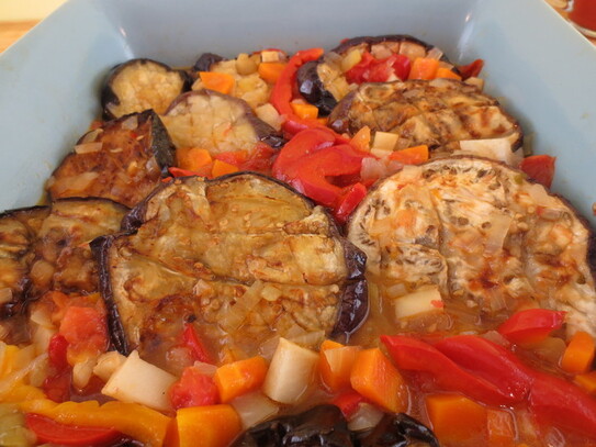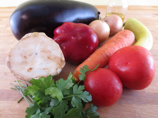 Legumele fierte de pun într-o tavă, alternându-se cu rânduri de felii de vinete, aşezate pe lăţimea tăvii. Se adăugă sare şi piper şi se pune la cuptor la 180 C, până când lichidul de pe legume scade. În felul acesta nu este nevoie să amesteci, iar legumele îşi păstrează forma, nu se zdrobesc. După ce se scoate din cuptor se presară pătrunjelul verde tocat mărunt.