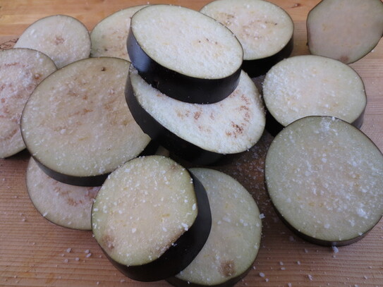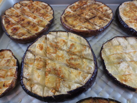 Vinetele se taie în felii groase de un cm, se presară cu sare, apoi se pun într-o strecurătoare la scurs. După o jumătate de oră, se clătesc cu apă rece, apoi se usucă cu ajutorul unui prosop de hârtie absorbantă. Feliile de vinete se crestează pe ambele părţi şi se ung cu ulei, de preferabil de măsline. Feliile de vinete se pun într-o tavă la grill la cuptor pentru câteva minute, până când încep să prindă o crustă uşor maronie, după care se scot şi se pun deoparte. (în reţeta originală vinetele se taie în cubuleţe şi se fierb 2-3 minute – preparate pe grill sunt mult mai gustoase, iar gustul uşor amărui al vinetei este eliminat în totalitate.)