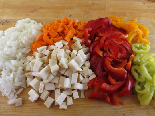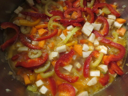 Se adaugă cubuleţele de morcovi şi ţelină, împreună cu rondelele de ardei şi gogoşarul tăiaţi felii. Se amestecă în continuare pentru câteva minute, după care se adaugă apă fierbinte atât cât să acopere legumele şi se înnăbuşă 4-5 minute.