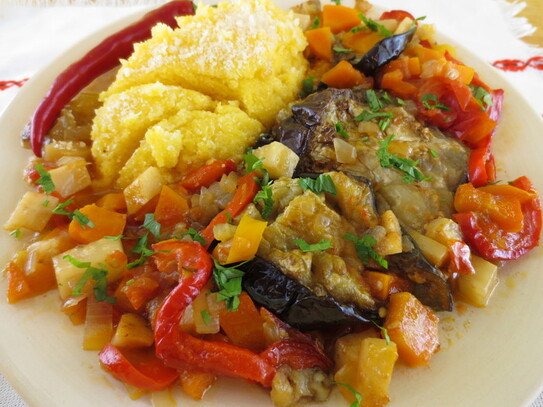 Tocăniţă moldovenească de vinete servită cu mămăliguţă