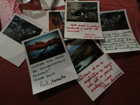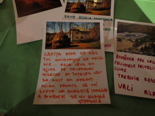 În răspuns, cei peste 50 de invitaţi români şi canadieni au scris la rândul lor mesaje de suflet pe cărţi poştale cu ilustrate din zona Roşia Montană.