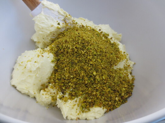 Crema se împarte în 2 părţi: o parte va fi folosită la umplut, iar cu cea din urmă se va îmbrăca tortul. În prima parte se adaugă jumătate din fisticul măcinat şi se amestecă până când se încorporează.
