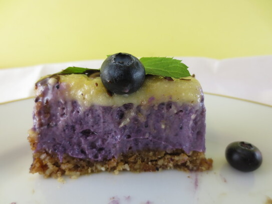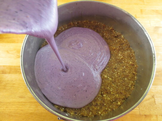 Se scoate tava din frigider şi se toarnă compoziţia de afine. Tava se dă din nou la frigider aproximativ 2 ore sau până când crema de afine se întăreşte.