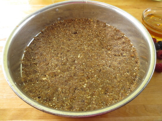 Nucile, alunele şi curmalele tăiate în bucăţi se pun toate într-un robot de bucătărie sau blender. Se mărunţesc bine, până când nucile sunt zdrobite fin, iar amestecul se lipeşte când e apăsat uşor cu degetul. Amestecul de nucă se pune în formă de tort detaşabilă, şi se întinde, apăsând pasta astfel încât să se lipească şi să formeze o foaie uniformă. Tava se pune la frigider şi se ţine până când se termină prepararea cremelor.