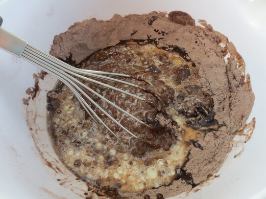 Într-un castron se amestecă împreună ingredientele uscate: zahărul, faină, cacao, praful de copt, vanilia şi sarea.