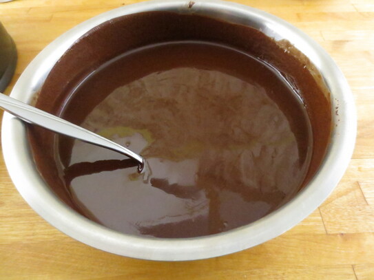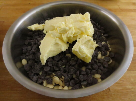 Într-un vas se amestecă ciocolata semi-dulce cu ciocolată albă şi untul. Se topeşte pe aburi, amestecându-se uşor până când conţinutul de omogenizează. Trebuie avut grijă să se ia de pe aburi înainte de a clocoti. Vasul se lasă deoparte să se răcească.