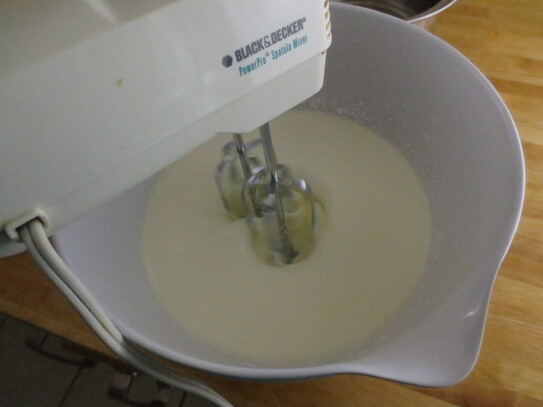 Se adaugă pe rând ouăle, laptele şi uleiul şi se amestecă până ce se combină.