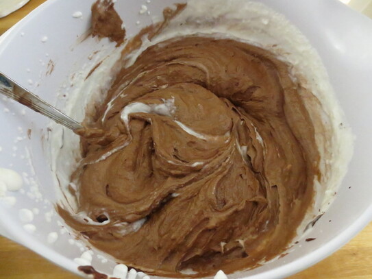 Frişca se adaugă pe rând în amestecul de ciocolată topită şi se amestecă uşor cu o spatulă pentru a încorpora complet crema.