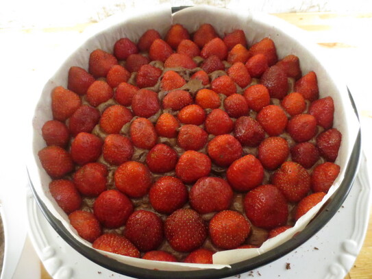 Se taie codiţele căpşunilor. O parte din căpşuni se taie în jumătate pe verticală şi se pun cu partea tăiată înspre interiorul pereţilor tăvii, aşezându-le una lângă cealaltă, de jur împrejur. Restul tăvii se completează cu căpşuni întregi de aproximativ aceeaşi mărime (cele mai mari se pot tăia puţin la bază).