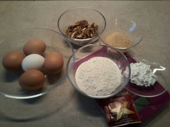 Se separă albuşurile de gălbenuşuri. Gălbenuşurile şi trei linguri de apă se freacă bine cu zahărul apoi se încorporează făina amestecată cu amidonul şi bicarbonatul. Opţional se adaugă un pliculeţ de zahăr vanilat şi una, două linguri de cacao. Separat albuşurile cu un praf de sare se bat până obţinem o spumă tare care se combină cu nuca măcinată fin. Spuma de albuşuri cu nucă se încorporează apoi cu o spatulă în compoziţia cu făină, amestecând uşor de jos în sus în aşa fel încât albuşurile să nu îşi piardă complet consistenţa spumoasă. Compoziţia se toarnă într-o formă de tort tapetată cu hârtie de copt şi se coace în cuptorul încălzit la 200 C timp de 30-35 minute. Blatul este copt atunci când scobitoarea înfiptă în el iese uscată. Scoateţi blatul din formă şi lăsaţi-l să se răcească pe un grătar.