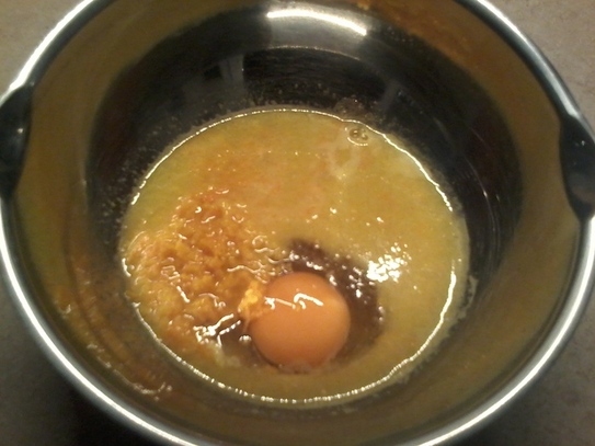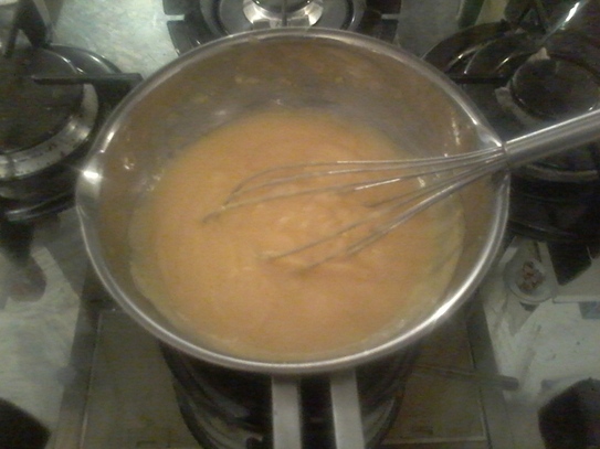 Se pun într-o crăticioară oul, zeama şi coaja de portocală şi zahărul. Se amestecă puţin compoziţia cu telul apoi se adaugă amidonul şi 75 gr unt.