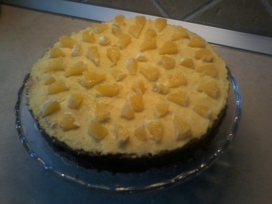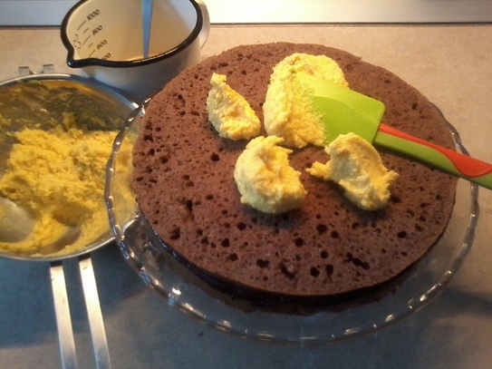 Prima foaie de blat se însiropează şi se unge cu 2/3 din crema de ciocolată. Peste cremă se aşează a doua foaie de blat care se însiropează şi se unge cu 2/3 din crema de portocale. Tăiaţi o portocală în bucăţele mici şi repartizaţi-le egal pe acest etaj. Deasupra se pune şi a treia foaie de blat care se însiropează.