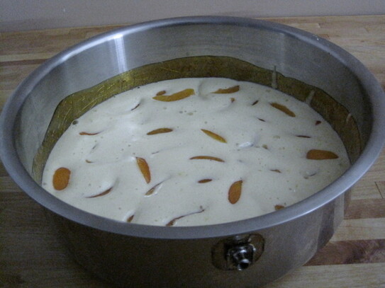 Compoziţia de blat se toarnă în cratiţa cu pereţii acoperiţi cu zahăr ars şi se nivelează. Deasupra se pun feliile subţiri de fructe.